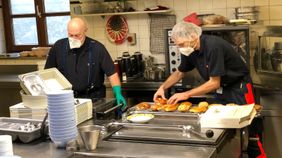 Mit Unterstützung durch das verbliebene Küchenpersonal bereiten jetzt täglich ein Feldkoch und ein Verpflegungshelfer für ca. 40 Personen Mittag- und Abendessen zu. Zum Start gab es Kürbiscremesuppe, Gemüsepflanzerl mit Kartoffeln und Paprikagemüse“, erklärt Florian Schubert von den Maltesern Mühldorf. „Wir legen großen Wert auf die Zubereitung mit frischen Zutaten wie z.B. Kartoffeln, Paprika oder Zwiebeln.“ Auch auf ihren gewohnten Nachmittagskaffee bzw. Tee mussten die Bewohner nicht verzichten. „Wir servieren Gebäck und Kuchen, jeder soll sich wohl fühlen“, lacht Schubert.