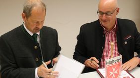 Garmisch-Partenkirchen. Ein Hausnotrufgerät kann Leben retten. Es gibt den Angehörigen Sicherheit und ermöglicht vielen Seniorinnen und Senioren ein langes und selbstbestimmtes Leben in der gewohnten Umgebung. Die beiden großen Sozialverbände in der Erzdiözese München und Freising Caritas und Malteser Hilfsdienst unterzeichneten bereits im vergangenen Dezember einen Rahmenvertrag, damit der Hausnotruf noch mehr Menschen zugutekommen kann. Für den Landkreis Garmisch-Partenkirchen unterschrieben Alexander Huhn, Kreisgeschäftsführer des Caritas Zentrum Garmisch-Partenkirchen und Dieter Wünsche, Bezirksgeschäftsführer der Malteser Hilfsdienst gGmbH, am 27. September einen Hausnotruf Kooperationsvertrag. Die neue Kooperation der beiden Sozialverbände hat zum Ziel, Kundinnen und Kunden der Caritas im Landkreis Garmisch-Partenkirchen auf deren Wunsch schnell und unkompliziert mit einem hochmodernen Hausnotrufgerät auszustatten. Dabei ist es ganz gleich, ob die älteren Menschen zu Hause, in Anlagen des Betreuten Wohnens oder anderen Senioreneinrichtungen leben.