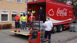mehrVier Paletten mit verschiedenen Erfrischungsgetränken für die Helfer