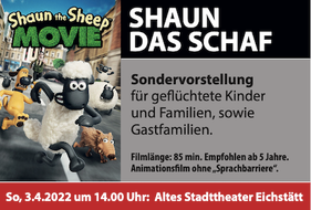 Gezeigt wird der Animationsfilm "Shaun das Schaf", der auch ohne Sprachkenntnisse verständlich ist und allen Kindern ab 5 Jahren sicher ein Lächeln auf das Gesicht zaubern wird. Beginn ist um 14 Uhr.