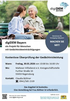 Die Veranstaltung findet am Freitag, 30. Januar 2026, von 10:00 bis 16:00 Uhr in der Malteser Hilfsdienst e.V. Kreisgeschäftsstelle, Further Straße 10, 93059 Regensburg, statt. Die Teilnahme ist kostenfrei, eine vorherige Anmeldung ist erforderlich. Ansprechpartnerin ist Claudia Büttner, erreichbar unter Telefon 0941 / 585 1539. digiDEM Bayern ist ein Projekt für Menschen mit Gedächtnisbeeinträchtigungen und wird vom Bayerischen Staatsministerium für Gesundheit, Pflege und Prävention gefördert.