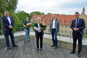 Jeweils einen Gutschein über 100 Euro und einen Blumenstrauß konnten Rietzel und Runge mit nach Hause nehmen, dazu den Dank von Dr. Volker Schmidt, Hauptgeschäftsführer Niedersachsenmetall, und Matthias Mehler, Vorstand der „Unternehmer Hildesheim“. Um die Ansteckungsgefahr zu minimieren, hatte Werner Fricke als Leiter der Geschäftsstelle nur eine kleine Zeremonie auf dem Dach der Bischofsmühle vorgesehen. So erhielten Rietzel und Runge ihre Geschenke als einzige offiziell, aber stellvertretend für alle anderen „Hildesheimer Corona Helden“, die ihre Gutscheine in den nächsten Tagen erhalten sollen. Warum ausgerechnet die Malteser? „Weil sie einen super Job machen“, wie Fricke sagte.