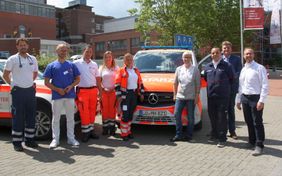 Gemeinsam wollen sich alle Beteiligten für die weitere Verbesserung der notärztlichen Versorgung der Bevölkerung einsetzen, das ist ihnen bei diesem Termin vor dem St. Marienkrankenhaus deutlich anzumerken.