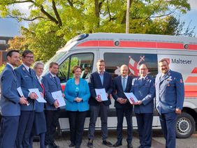 Mit dabei waren auch Vertreter der Kreisverwaltung und des DRK-Kreisverbandes Steinfurt sowie Angehörige. Anlass war die Verleihung der Einsatzmedaille „pro merito melitensi - COVID 19“ an verdiente Einsatzkräfte, die mindestens 250 Einsatzstunden bei Coronaeinsätzen oder im Einzelnen Herausragendes geleistet haben.