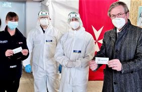 Nichts ist derzeit so wichtig, wie regelmäßiges Testen. Das hat jetzt auch Bürgermeister Michael Dreier mit seinem Besuch im Testzentrum der Malteser unterstrichen. Auf Einladung der Paderborner Malteser-Stadtbeauftragten Stefanie Friemuth hatte Dreier das bereits vor drei Wochen eingerichtete Testzentrum in der Karl-Schurz Straße 30 besucht. Dabei überzeugte er sich gleichzeitig über den reibungslosen und kontaktarmen Ablauf bei den Schnelltests. Nach der Buchung über das Anmeldeportal kommen die Bürger punktgenau zu ihrem Termin in das Zentrum, erhalten nach Vorlage ihres zugesandten QR Codes ein Testset; der Stäbchentest wird durchgeführt. Im besten Fall, so hat es auch Michael Dreier erlebt, dauert der ganze Vorgang keine drei Minuten und die Bürger können beruhigt nach Hause fahren. Denn das Ergebnis wird ihnen bereits kurze Zeit später per Mail geschickt, bei Bedarf als ausdruckbare Bescheinigung.