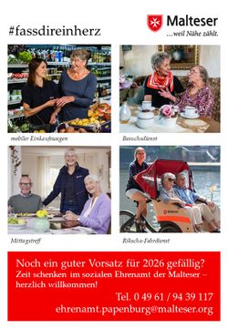 mehrPapenburg. Der Malteser Hilfsdienst in Papenburg e.V. führt am Samstag, 21.03. und Sonntag, 22.03.2026 von 9:00 bis 17:00 Uhr einen Lehrgang zur „Aktivierung von Senioren“ durch. Die Kos-ten betragen…