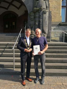 Am Nachmittag des 30.06.2022 sind wir der Einladung des Recklinghäuser Bürgermeisters Christoph Tesche ins Rathaus gefolgt, um an der Ehrung eines langjährigen Mitgliedes der Malteser teilzuhaben.