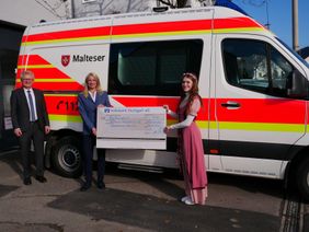 Mit einer großzügigen Spende in Höhe von 500,- € überraschte die Volksbank Stuttgart eG die Malteser im Rems-Murr-Kreis. Den Scheck, den Herr Harald Auwärter, Regionaldirektor der Volksbank Stuttgart eG in Winnenden, und das „Winnender Mädle“ Giuliana Di Donna gemeinsam überreichten, nahm Frau Annette Traub als Bezirksreferentin der Malteser mit großer Freude entgegen. Giuliana Di Donna durfte sich in ihrem Amt als Winnender Mädle den Empfänger der Spende aussuchen. „Da ich selbst derzeit mein Freiwilliges Soziales Jahr beim ASB mache, habe ich einen Einblick in die derzeitigen Nöte an diesen Stellen. Daher weiß ich, dass in diesen schwierigen Zeiten neben den alltäglichen lebensnotwendigen Instrumenten auch eine ausreichende Schutzausrüstung notwendig ist“, so Giuliana Di Donna. Annette Traub zeigte sich sehr dankbar über die großzügige Geste der Volksbank Stuttgart eG und dankte Herrn Auwärter. „Eine so tolle Aktion, ich freue mich sehr. Von dem Geld werden wir für Ausrüstung und Einsatzkleidung beschaffen können", freut sich Annette Traub.