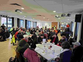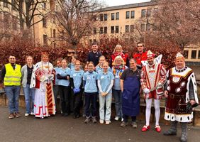 Am 31. Januar fand der erste Wohlfühlmorgen für obdachlose und arme Menschen im neuen Jahr statt. Wie bereits in den Jahren zuvor, konnten die Gäste, die Malteser-Helfer:innen und die Schülerinnen der Ursulinenschule sich auf ein kleines Karnevalsprogramm freuen. Den Auftakt machte Weihbischof Ansgar Puff mit roter Perücke und einem sehr gelungenen karnevalistischen Impuls. Danach füllte sich der Saal mit zahlreichen ‚Appelsinefunke‘, die Nippeser Bürgerwehr war mit ca. 130 Repräsentanten incl. Stabsmusikzug und Tanzpaar gekommen. Den Höhepunkt bildete das Kölner Dreigestirn - Prinz, Bauer und Jungfrau fanden den richtigen Ton, sangen und schunkelten mit den Gästen. Den Abschluss bildeten die ‚Lyskirchener Hellige Knäächte un Mägde‘ und die Kindertanzgruppe der EhrenGarde Köln, die trotz Platzmangel im Saal mit ihren Tänzen für bewegte Stimmung sorgten.