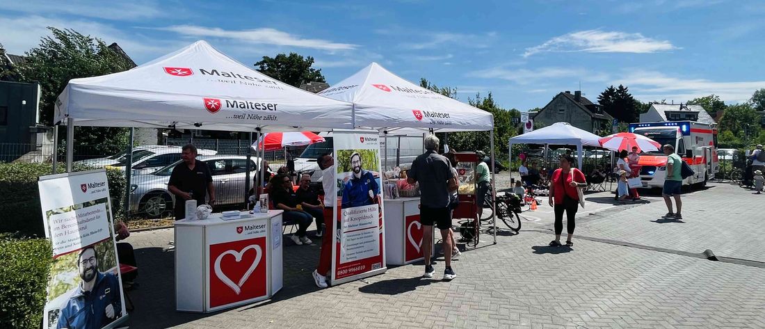 Mitarbeiterinnen und Mitarbeiter des Malteser Rettungsdiensts, des Schulbegleitdiensts, des Hausnotrufs sowie aus der Dienststelle in der Pulheimer Venloer Straße 144 waren mit vielen ehrenamtlich Engagierten am Samstag ein Team und stellen die verschiedenen Dienste und Angebote vor und verteilten kleine Geschenke.