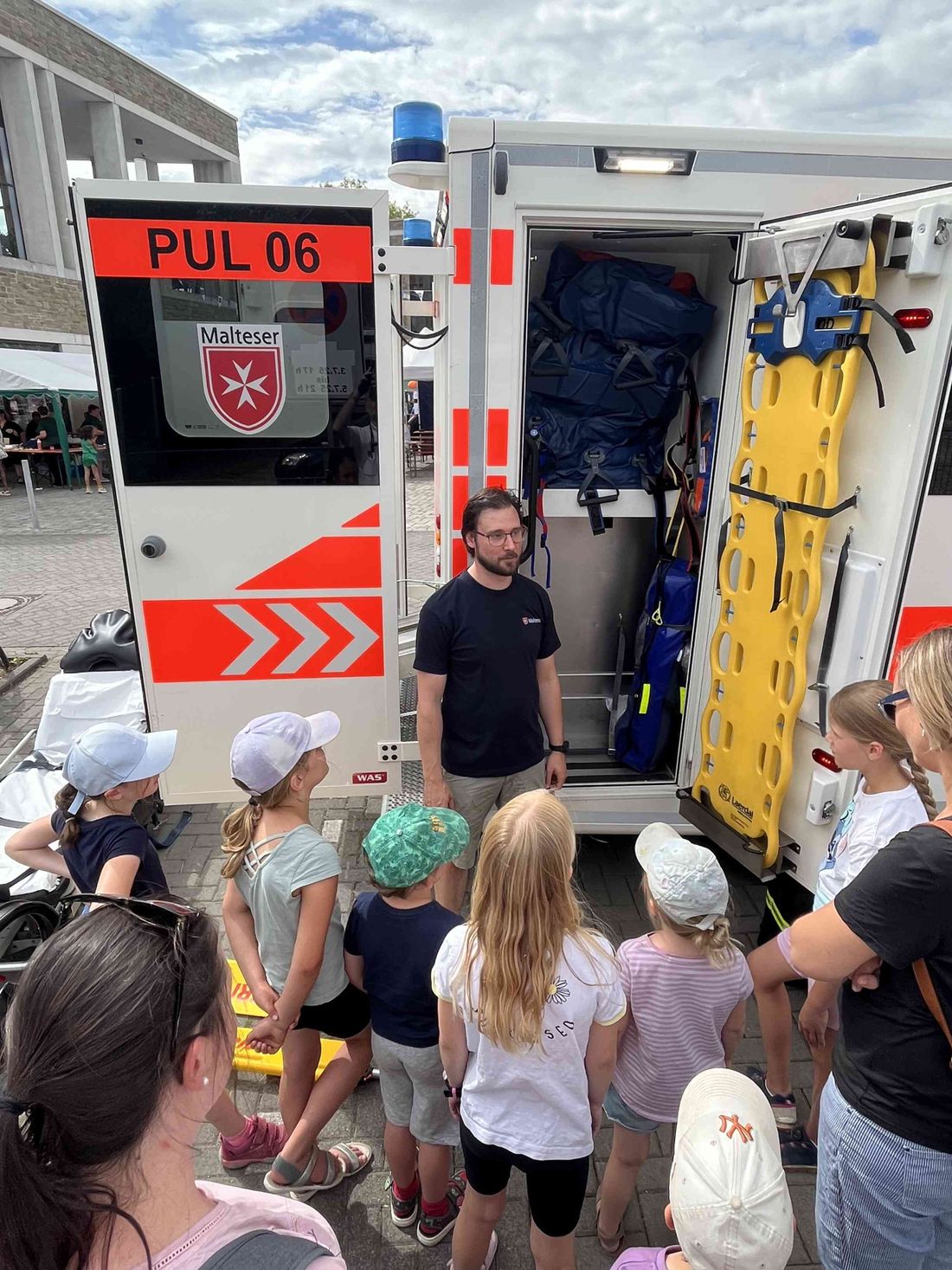„Was für eine tolle Stimmung! Unseren herzlichsten Dank allen kleinen und großen Gästen des gemeinsamen Stands von Haupt- und Ehrenamt sowie den vielen Helferinnen und Helfern vor und hinter der sprichwörtlichen Bühne! Dazu gehören auch die Sanitätsdienstleistenden unserer Gliederung Erftstadt, die die Veranstaltung absicherten.“ Oliver Röhrs war mit Olaf Beuth, beide Geschäftsführer des Malteser Hilfsdienst e.V. im Bezirk Rheinland West, begeistert von der Teamleistung aller Malteser und dem großen Anklang des Auftritts beim Publikum des 42. Pulheimer Stadtfests. Egal ob aus dem Rhein-Kreis Neuss, dem Rhein-Erft-Kreis oder der Stadt Köln – Malteser aus dem gesamten Bezirk hatten ein buntes Programm zu bieten. Auch Bürgermeister Frank Keppeler nahm sich die Zeit die Attraktionen auf dem Vorplatz des Kultur- und Medienzentrums in Augenschein zu nehmen. „Vielen Dank für den haupt- und ehrenamtlichen Einsatz der Malteser! Wir wissen um das große Engagement innerhalb der Malteser-Familie und reichen die zahlreichen Dankesworte, die wir immer wieder erhalten, nur zu gerne weiter!“ so Röhrs und Beuth.