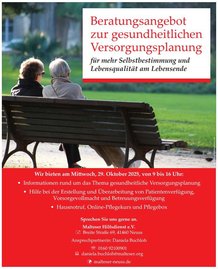 Um auch am Lebensende über genügend Selbstbestimmung und Lebensqualität zu verfügen, bietet der Malteser Hilfsdienst e.V. im Bezirk Rheinland West eine kostenlose Beratung in Neuss an. Im Rahmen der gesundheitlichen Versorgungsplanung können Themen wie Hilfe bei der Erstellung und Überarbeitung von Patientenverfügung, Vorsorgevollmacht und Betreuungsverfügung ebenso zur Sprache kommen wie der beliebte Malteser Hausnotruf, Online-Pflegekurse und die Pflegebox.