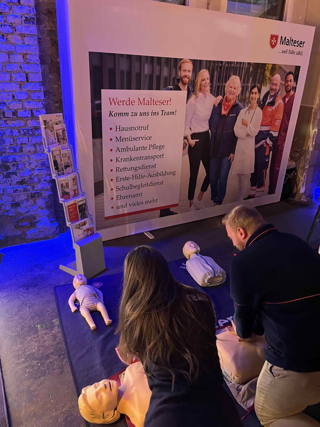 Marcel Otto, Leiter Ausbildung im Rhein-Kreis Neuss, zeigte anhand der Wiederbelebungspuppen „Anni“ die Bedeutung der Laienreanimation für das Überleben in Notsituationen. Interessierte können sich im Rahmen der Malteser Erste-Hilfe-Ausbildung schulen lassen; ein Angebot, das auch für Unternehmen mit Blick auf ihre Mitarbeitenden spannend ist.