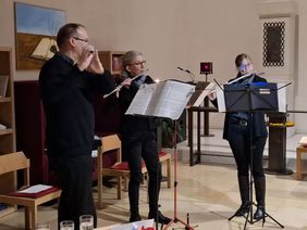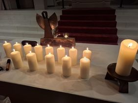 Während der Gedenkfeier wurden neben Texten wie 'Farben der Trauer' auch alle Namen der Verstorbenen vorgelesen. Für jeden Monat wurde im Gedenken an sie eine große Kerze angezündet sowie ihrer zum Ton der Klangschale in Stille gedacht. Zusätzlich bestand für die rund 50 Anwesenden die Möglichkeit, ein Teelicht für ein persönliches Gedenken anzuzünden. Das Flöten-Trio 'Pastorale' aus K-Dellbrück trug mit Instrumentalmusik zur angemessenen Atmosphäre bei und Pater Carlos, der selbst viel Erfahrung als ehrenamtlicher Sterbebegleiter hat, fand zum Abschluss tröstende Worte und spendete den Segen.