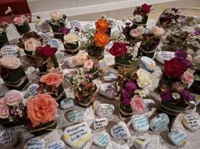 Ingrid Schreiber hatte dafür wunderschöne Blumen-Sushis gestaltet und Michael Heinrichsdorff seine inspirierenden Engel-Kunstwerke zur Verfügung gestellt. Verena Brunkhorst und Susanne Wahrburg hatten im Vorfeld für jede begleitete Person einen Stein beschriftet, den die An- und Zugehörigen im Anschluss mitnehmen durften.