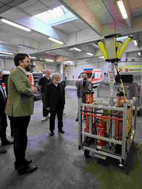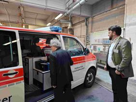 Nach einem ersten Kennenlernen und Vorstellen der verschiedenen Bereiche innerhalb der Malteser ging es in die Wagenhalle. Dort stellte Lukas Preußler – zusammen mit Helfer Florian Müller von den Einsatzdiensten - den neuen mobilen Kaffeewagen des Betreuungsdienstes sowie das neue mobile Stromaggregat mit ausfahrbarer und sehr heller Beleuchtung vor. Letzteres kommt insbesondere am Abend/in der Nacht z.B. an einer Unfallhilfsstelle zum Einsatz. Weihbischof Steinhäuser und seine beiden Begleiter zeigten sich sehr interessiert und stellten mehrere Fragen.