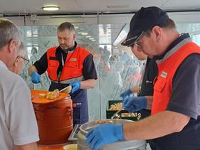 Bereits am Vortag reiste die Gliederung Kirchheim an. Die Helfenden bereiteten, wie schon seit vielen Jahren, auch bei diesem Sonnenzug die Verpflegung vor. Dieses Jahr gab es 800 Portionen Kartoffelsuppe mit insgesamt 1220 Saitenwürstchen.