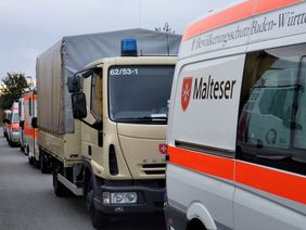 „Eine theoretische Schulung reicht aber nicht aus – eine Kolonne muss auch einfach einmal erlebt werden“, sagt Dominik Spies, stellvertretender Leiter Notfallvorsorge der Kirchheimer Gliederung. Deshalb hatten die dortigen Malteser diese spezielle Übung vorbereitet und die übrigen Gliederungen aus dem Bezirk Neckar-Alb zur Teilnahme eingeladen. Mit Blaulicht und Beflaggung ging es anschließend mehrere Stunden lang kreuz und quer durch den Landkreis Esslingen, zudem wurde ein längerer Abschnitt der Autobahn befahren. Doch wozu überhaupt eine Kolonnenfahrt? „In einer Kolonne kann eine komplette taktische Einheit gleichzeitig verlegt werden“, erklärt Spies. Damit haben die Einsatzkräfte an Ort und Stelle ganz andere Möglichkeiten, sofort in den Einsatz zu gehen – und müssen nicht darauf warten, dass die langsameren LKWs hinterherkommen. Bleibt ein Auto liegen, kann zugleich schnell Hilfe organisiert werden.