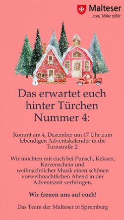 mehrKommen Sie am 4. Dezember um 17.00 Uhr zum lebendigen Adventskalender in die Turnstraße 2 in Spremberg. Wir möchten mit Ihnen bei Punsch, Keksen, Kerzenschein und weihnachtlicher Musik einen schönen…