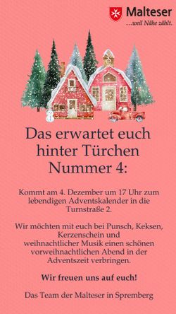 mehrKommen Sie am 4. Dezember um 17.00 Uhr zum lebendigen Adventskalender in die Turnstraße 2 in Spremberg. Wir möchten mit Ihnen bei Punsch, Keksen, Kerzenschein und weihnachtlicher Musik einen schönen…