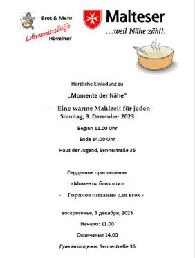 Am ersten Advent, Sonntag, den 3. Dezember zwischen 11 und 14 Uhr, laden die Malteser Hövelhof und die Lebensmittelhilfe „Brot & Mehr“ der Kolpingsfamilie zu einem leckeren Eintopfessen ein.