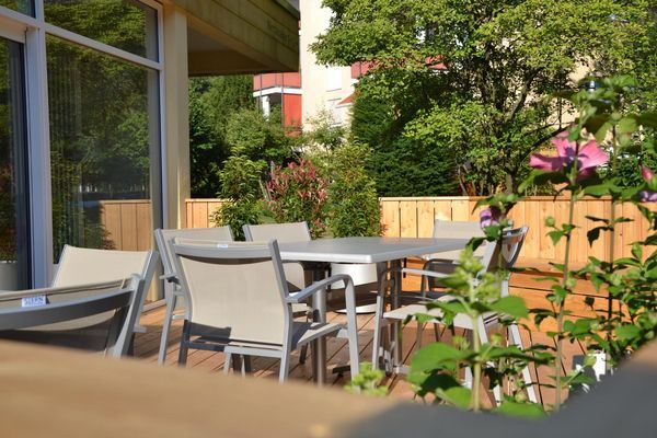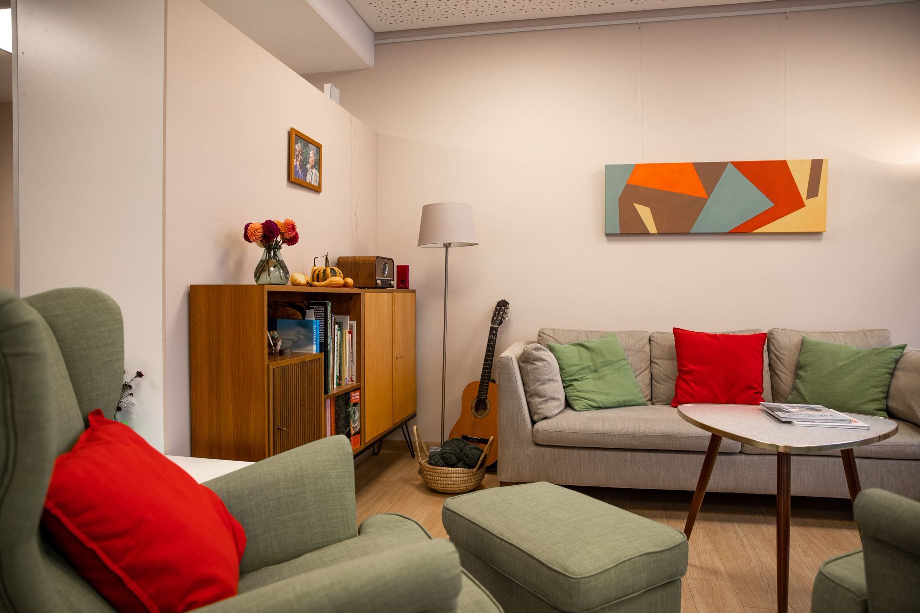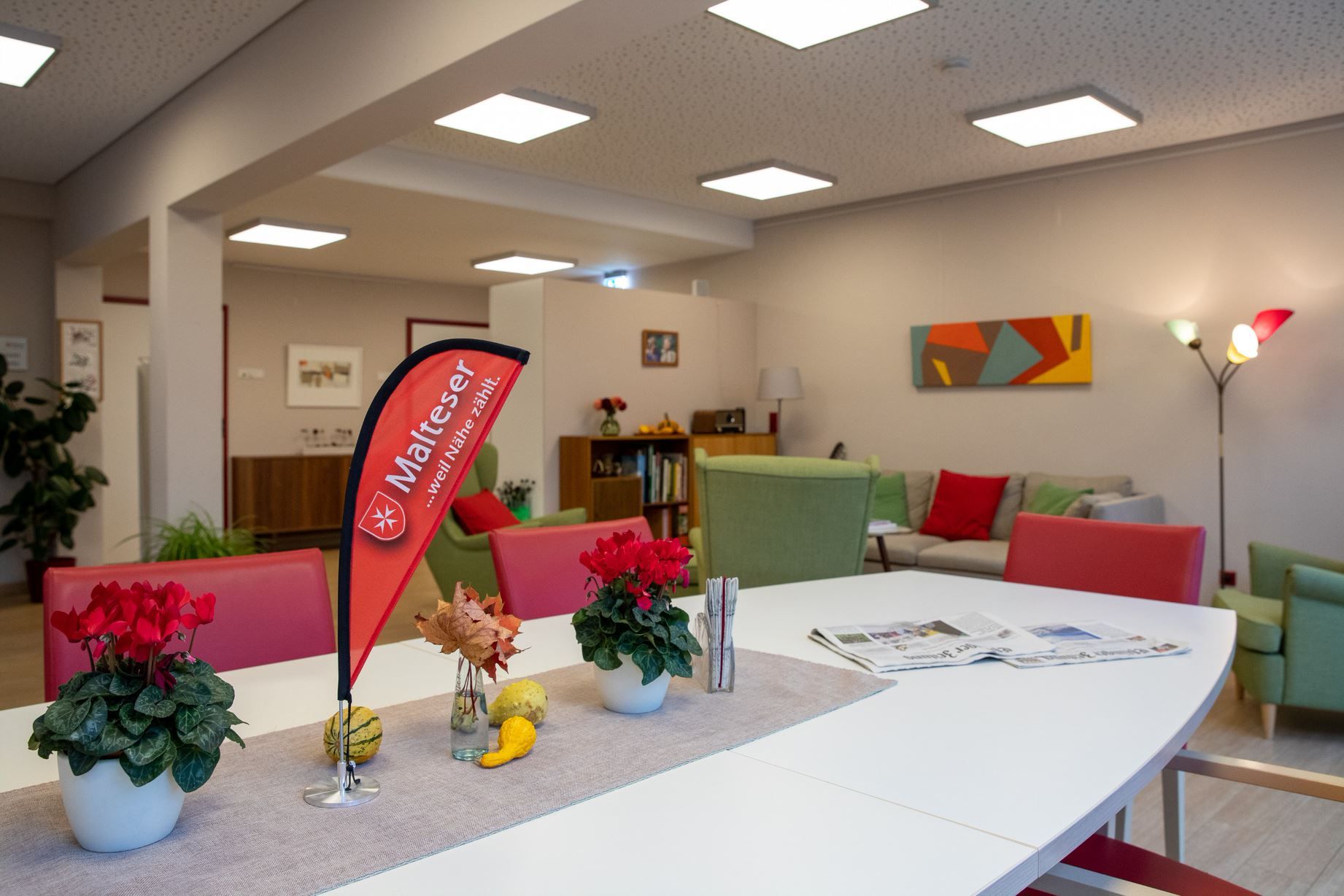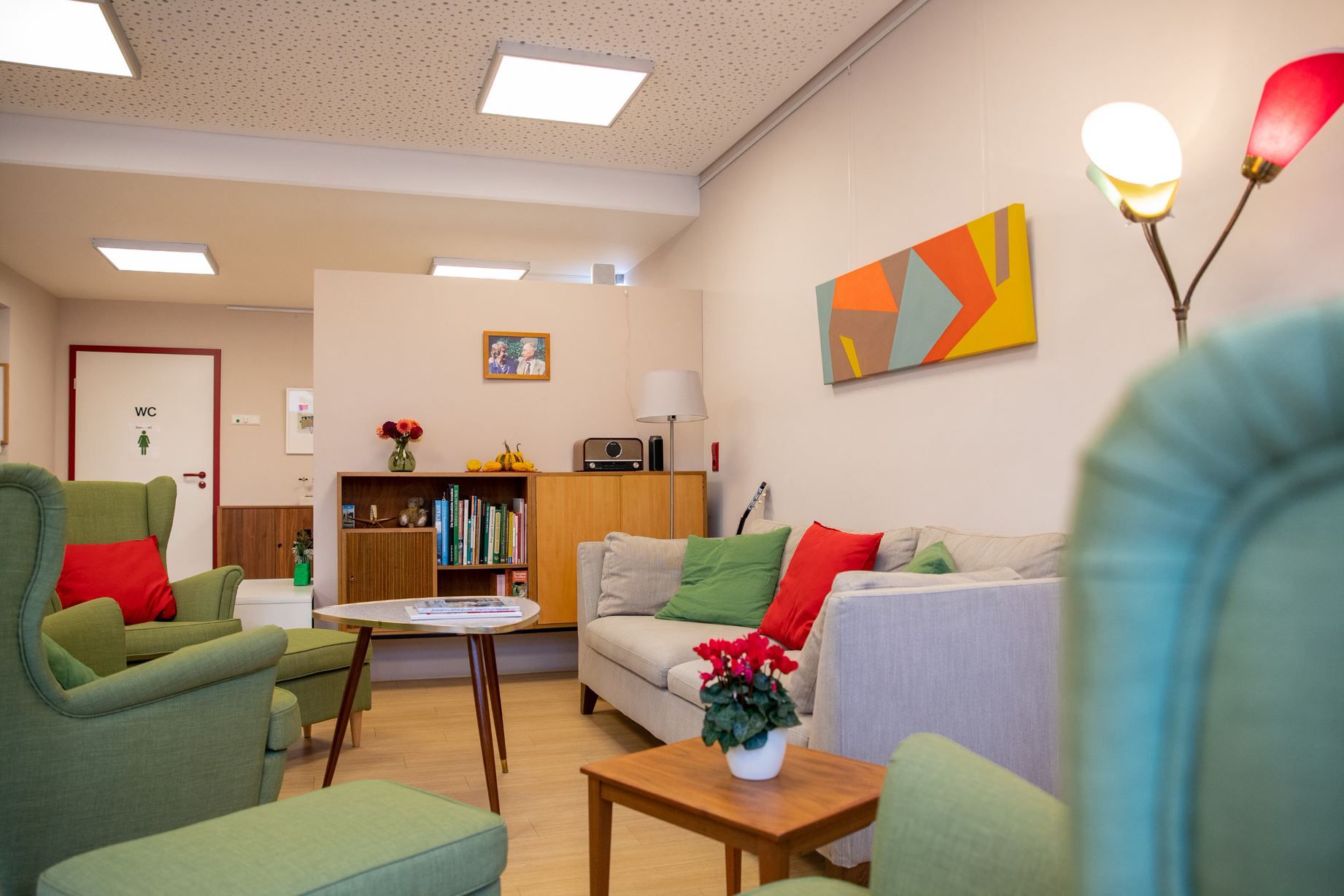 Der Tagestreff bietet eine geborgene, leicht verständliche und sichere Umgebung: helle Böden und farbenfrohe Bilder an den Wänden strahlen Freundlichkeit und Ruhe aus. Das spezielle Farbkonzept in den Räumlichkeiten ist orientierungsgebend und unterstützt Aktivitäts- und Ruhephasen der Gäste. Eine Terrasse bietet die Möglichkeit zum Verweilen im Freien.