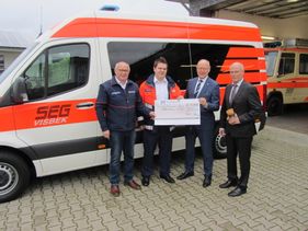 Diese Neuanschaffung nutzen die beiden Vorstände der Volksbank Visbek , Walter Toennies und Gerd Bahlmann , um die Malteser am Montag den 03.12.2018 zu besuchen. Der Ortsbeauftragte Alfons Hoping begrüßte zusammen mit dem Leiter der SEG , Fabian Emken, die beiden Gäste. In einer gemüdlichen Runde berichteten die beiden Malteser von den unterschiedlichen Diensten, die die Malteser in Visbek anbieten. Bei dem Besuch überreichten die Vertreter der Bank einen symbolischen Scheck über 1 000 Euro zur Unterstützung für das Fahrzeug. In dieser Form bedanken sich die Visbeker Malteser ,,für diese Unterstützung" bei der Visbeker Volksbank.