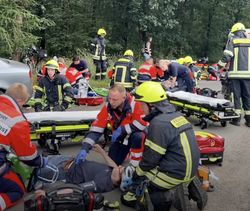 mehrDas Szenario der Notlage: Ein Massenunfall (MANV15) in Osterfeine. Ein Fahrzeug war hinter einer Kurve in eine Gruppe von Radfahrenden gefahren. Einsatzkräfte aus dem gesamten Landkreis Vechta wurden mobilisiert. Laienschauspieler mimten geschminkt Verletzte.