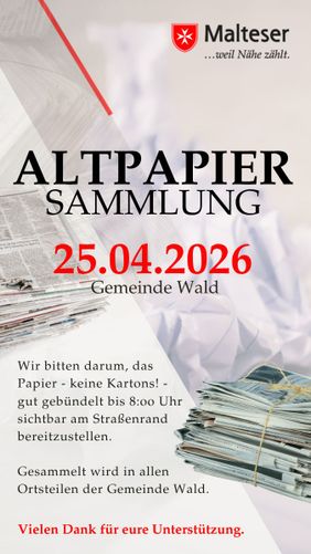 Unabhängig von den regulären Abholterminen der blauen Tonne, führt der Malteser Hilfsdienst Wald am Samstag, dem 25. April 2026 eine Altpapiersammlungen durch. Bitte das Papier - keine Kartons! - gut gebündelt bis 8:00 Uhr sichtbar am Straßenrand bereitstellen. Gesammelt wird in allen Ortsteilen der Gemeinde Wald.