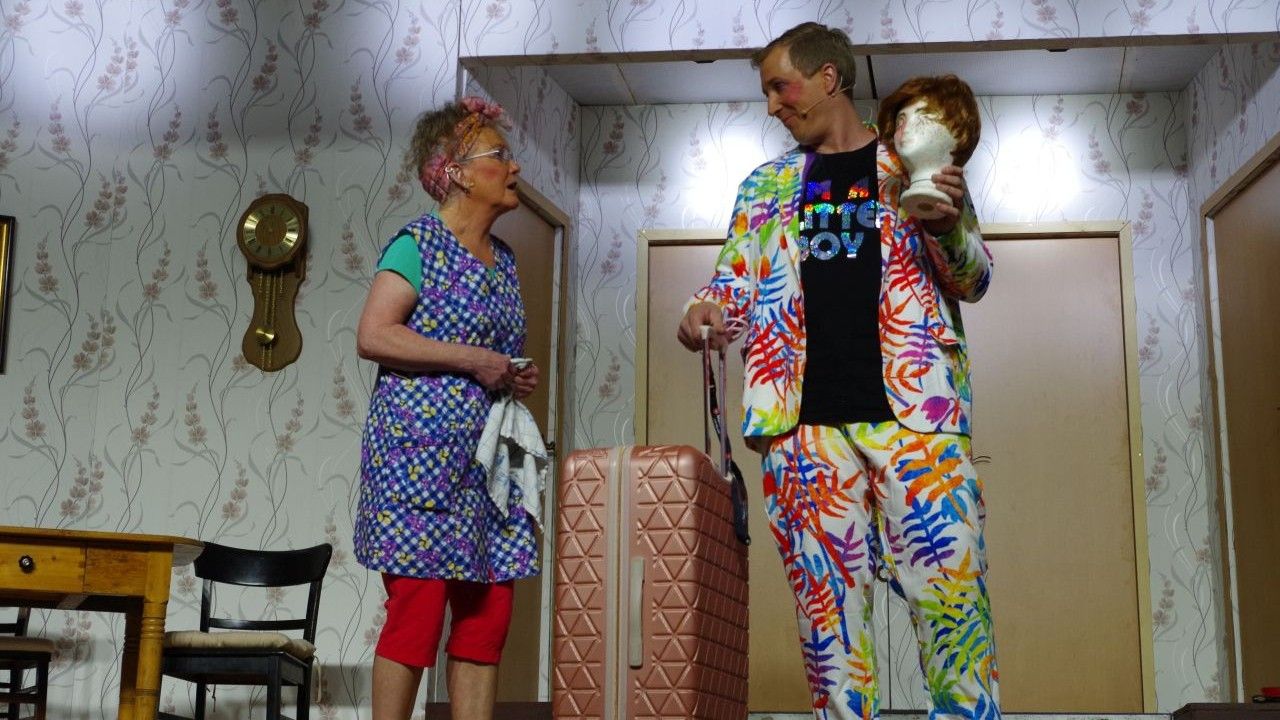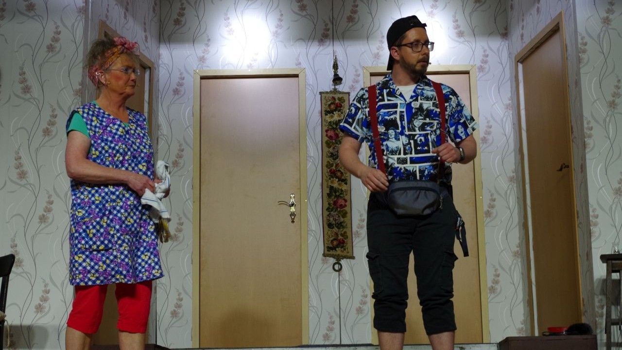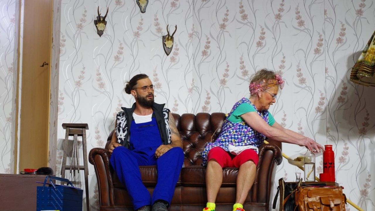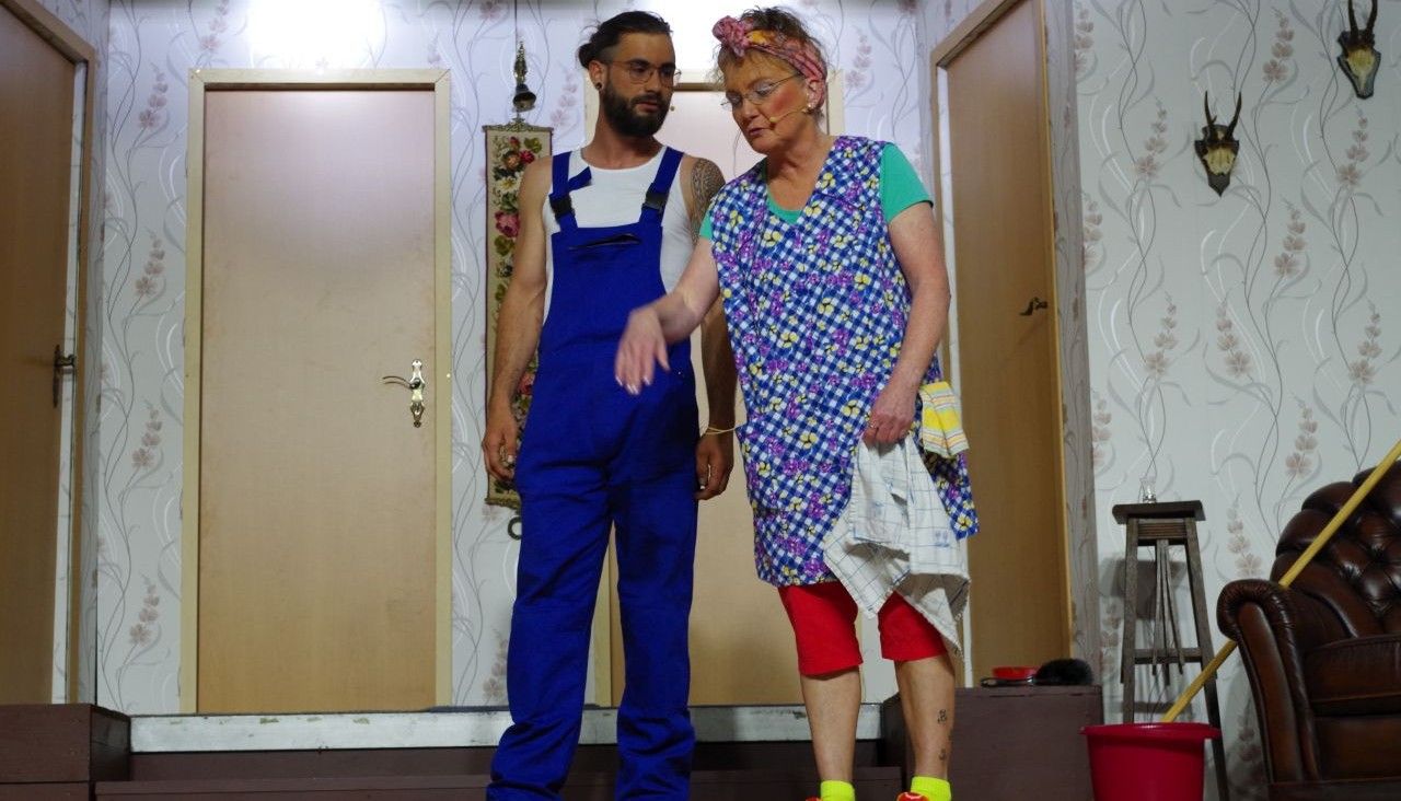 Else hatte alles im Blick und stellte ganz schnell fest, dass dies keine Wohnung, sondern ein Taubenschlag sei. Das „arme Jungchen“, kaum hatte es sich von seiner Übermutter abgenabelt, legte es sich wieder Ballast um den Hals und dann auch noch diese Schrapnelle von Malerin. Als dann noch Martins Übermutter Luzy (Rica Bechmann), die die Nabelschnur als Lasso für ihren Bubi verwendet, auftauchte und ihren Sohn wiederhaben wollte, schulterte Fred sie auf Anweisung von Else wie einen Mehlsack und beförderte sie nach draußen.