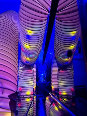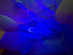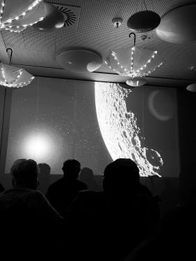 Sieben kunstvoll beleuchtete Hände formten unseren Slogan und begrüßten die Gäste bereits beim Eintreten… Der Sternhimmel war an der Rezeption zu sehen. Im Bistro entstanden durch farbig leuchtende Schläuche faszinierende Lichtspiele. Eine gigantische Discokugel funkelte darüber und weckte Erinnerungen an unsere beliebte „Boni. Bar“-Partyreihe. Auf die 4m große Leinwand wurden verschiedene Bilder aus aller Welt projiziert. z.B: Vom leuchtenden Sonnenuntergang über den aufziehenden Sternenhimmel bis hin zum hellen Mond: Diese Abfolge war ein besonderes Highlight, das nicht nur Raumfahrtfans an die bahnbrechende Apollo-11-Mission erinnerte. Für eine reizvolle Mischung aus Humor und Mystik schwebten über den Köpfen der Besucher 14 Regenschirme, die wie schimmernde Lichtwolken für zusätzliche Atmosphäre sorgten. Draußen im Innenhof sorgten sanft beleuchtete Geister & Co für Stimmung. Bei Glühwein, Kakao und Winterpunsch kamen rund 90 Bewohnerinnen und Bewohner zusammen, um diesen besonderen Abend in gemütlicher, wohliger Stimmung miteinander zu verbringen.