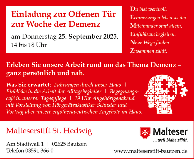 Das Malteserstift St. Hedwig verfügt über vier Wohnbereiche und liegt inmitten einer großzügigen Grünanlage direkt am Stadtwall, dem grünen Ring der Stadt Bautzen. Das historische Altstadtzentrum mit diversen Einkaufsmöglichkeiten ist zu Fuß gut erreichbar, eine Bushaltestelle gewährt eine gute Anbindung an das öffentliche und überregionale Verkehrsnetz. Ebenfalls am Stadtwall befindet sich ein Ärztehaus mit fachärztlichen und therapeutischen Angeboten, die die Bewohner wahrnehmen können.