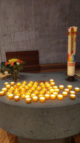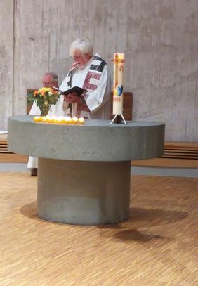 Der schlichte Steinaltar - geschmückt mit einer Osterkerze, frischen Blumen und vielen brennenden Teelichtern - wurde zum Mittelpunkt der Feier.