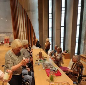 Ein besonderes Highlight wartete am Ende des Nachmittags: Gemeinsam mit den Museumsmitarbeitenden schlugen die Bewohnerinnen und Bewohner Butter wie zu Großmutters Zeiten – mit Muskelkraft und viel Freude. Dazu gab es duftendes Brot, das alle gemeinsam genossen.